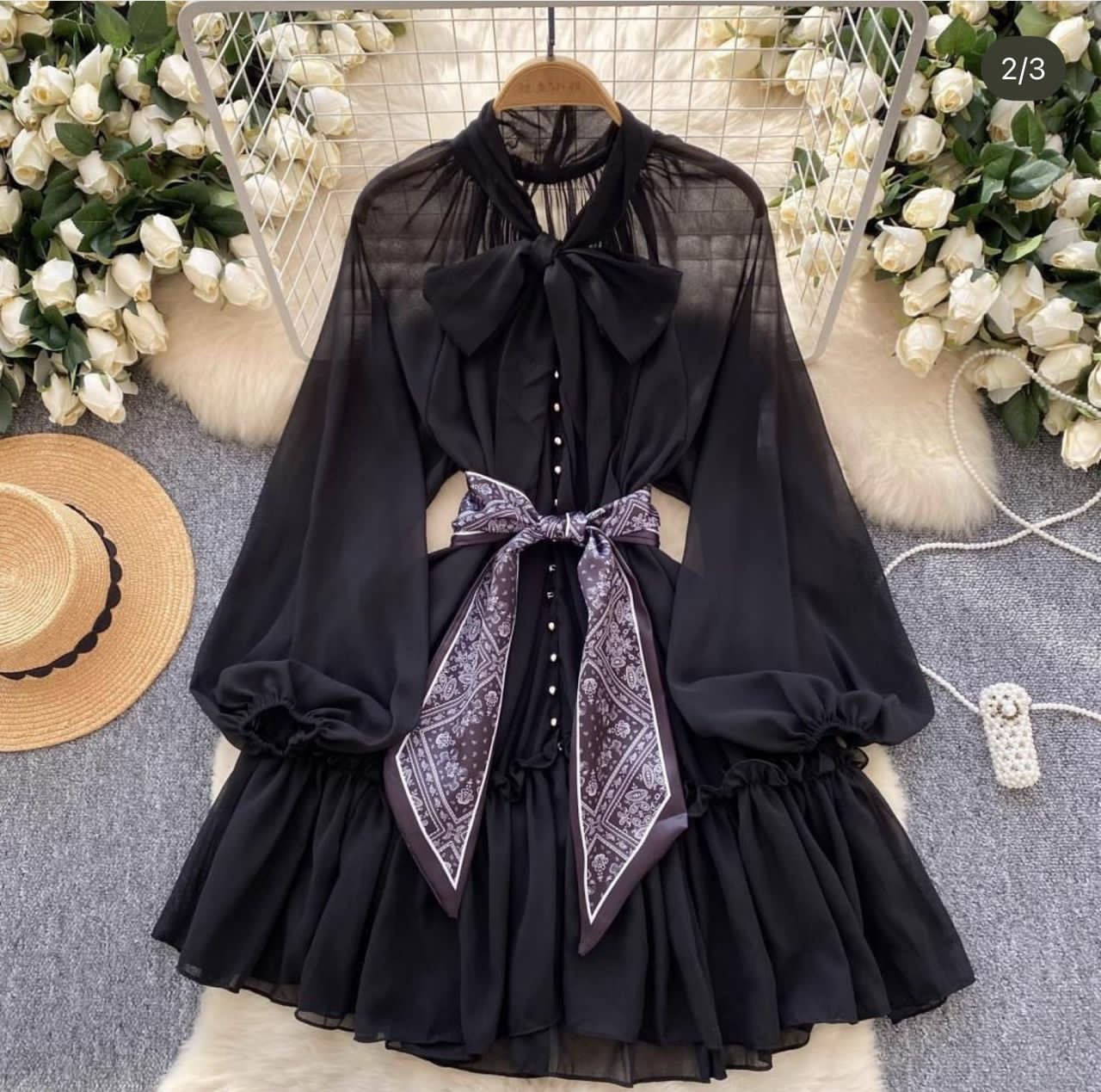 The dress is made of a sheer fabric and has small pearl-like buttons down the front. While the brand name is not visible, similar dresses are available from various retailers and designers