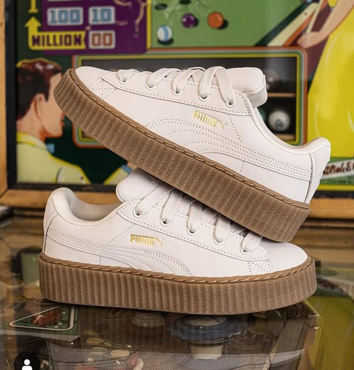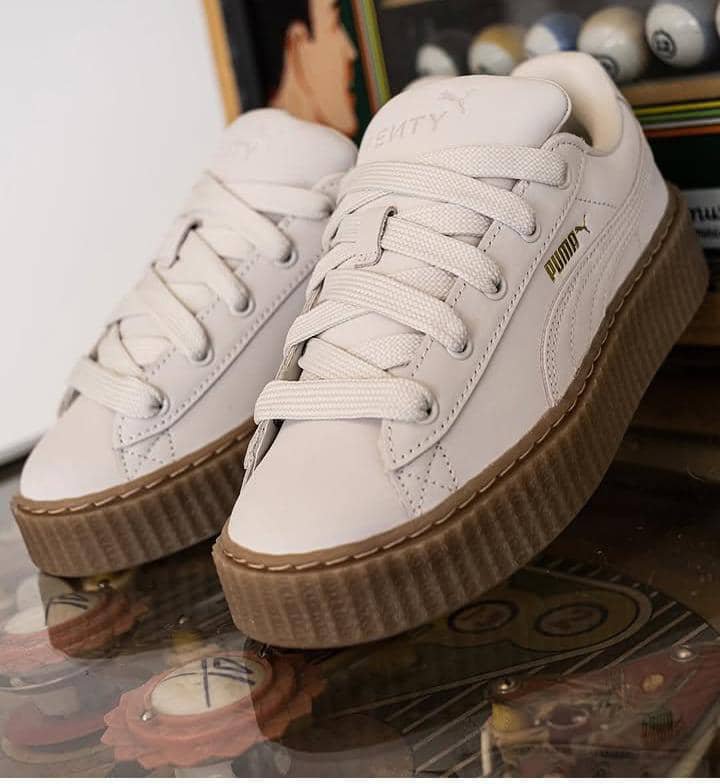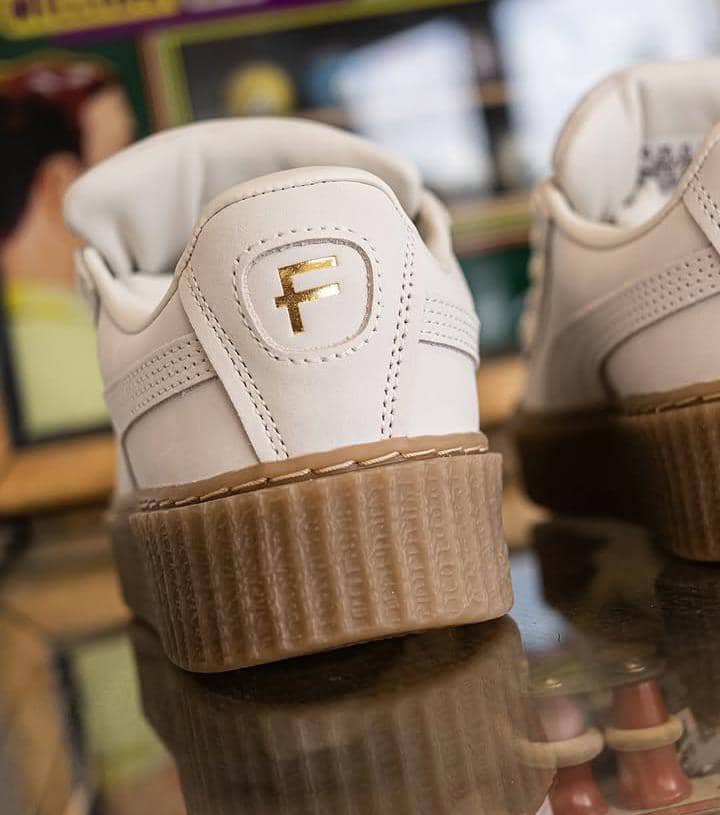 They are a low-top sneaker with a thick platform sole. The upper is made of nubuck leather, and the colorway in the image is “Earth Tone,” featuring a warm white upper with a gum-colored sole.