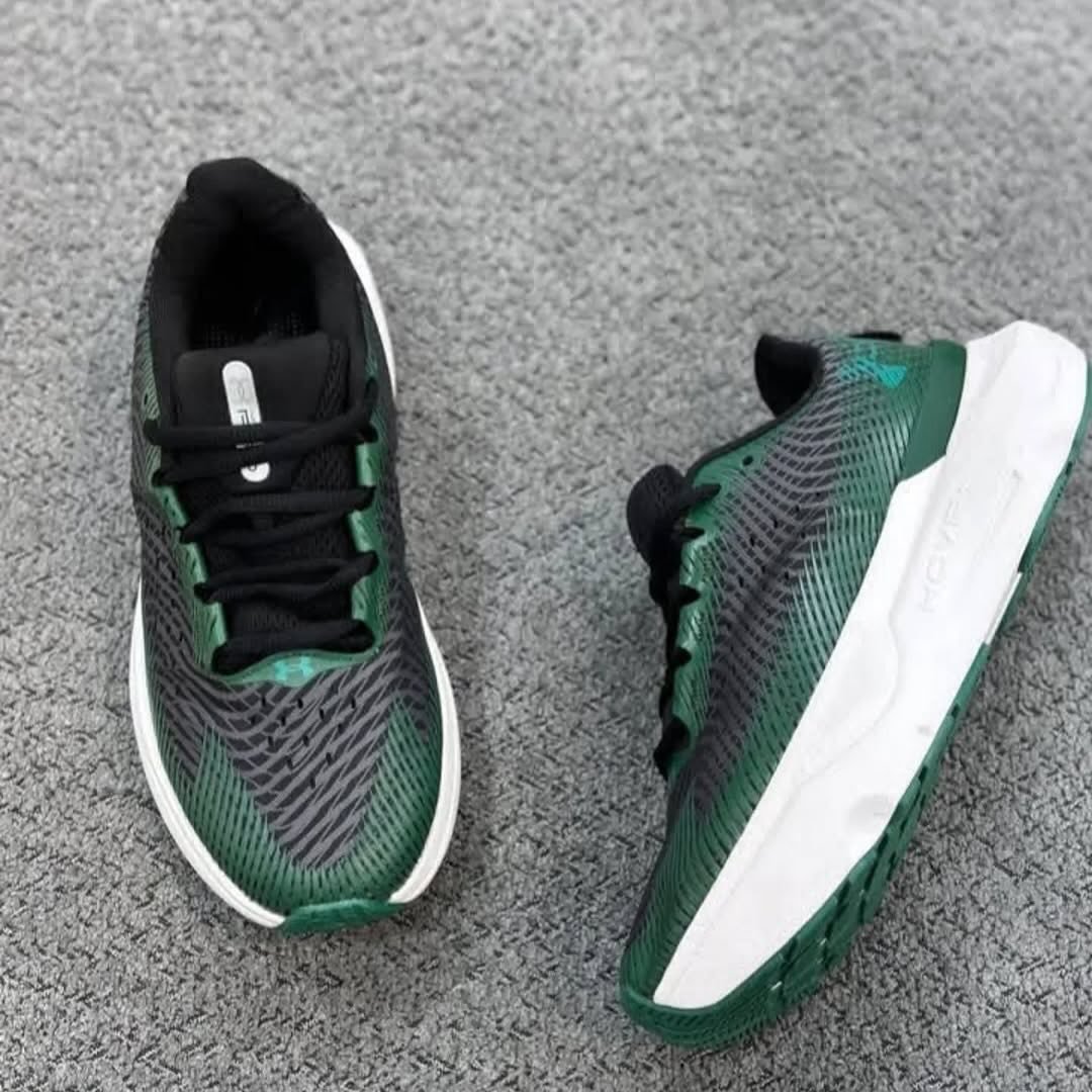 The upper part of the shoe features a gradient design, transitioning from dark green at the toe to gray towards the midfoot. The sole is white with green accents on the outsole. The interior lining and tongue are black, and the Under Armour logo is visible on the tongue and the side of the shoe.