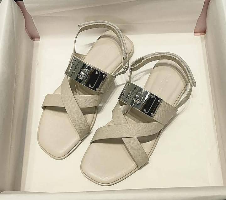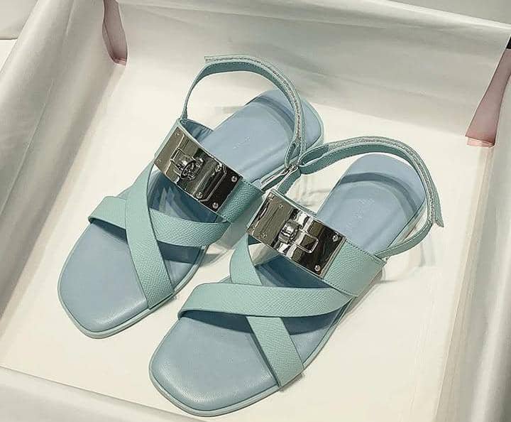 However, this version features a closed design with a metal clasp over the “H” shape, which is not part of the standard Oran style. The color is a light blue, and the sandals have a flat sole with crossed straps and an ankle strap. The metal clasp is silver-toned.