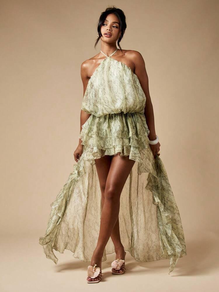 Design: Features a halter neck with a high-low (waterfall) hemline and multiple tiered ruffles.