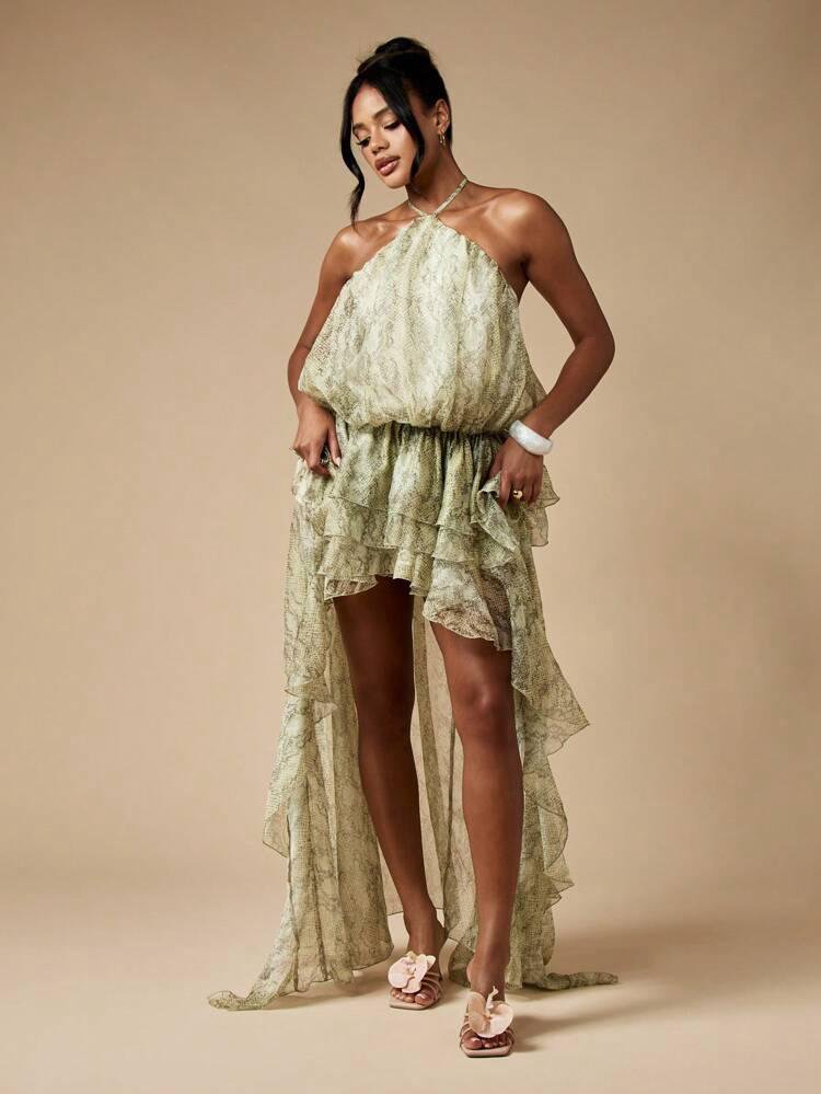 This dress is the MISSGUIDED Snake Print High Low Halter Dress With Tiered Ruffles.