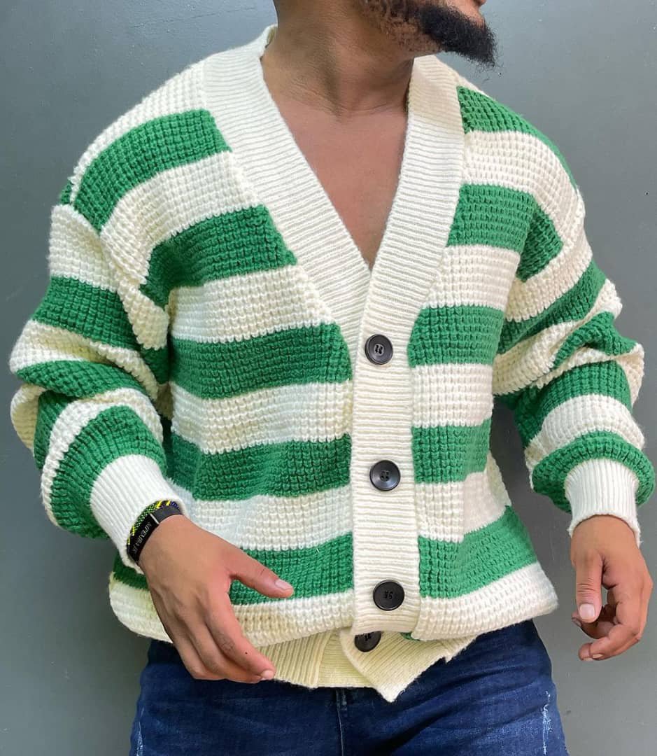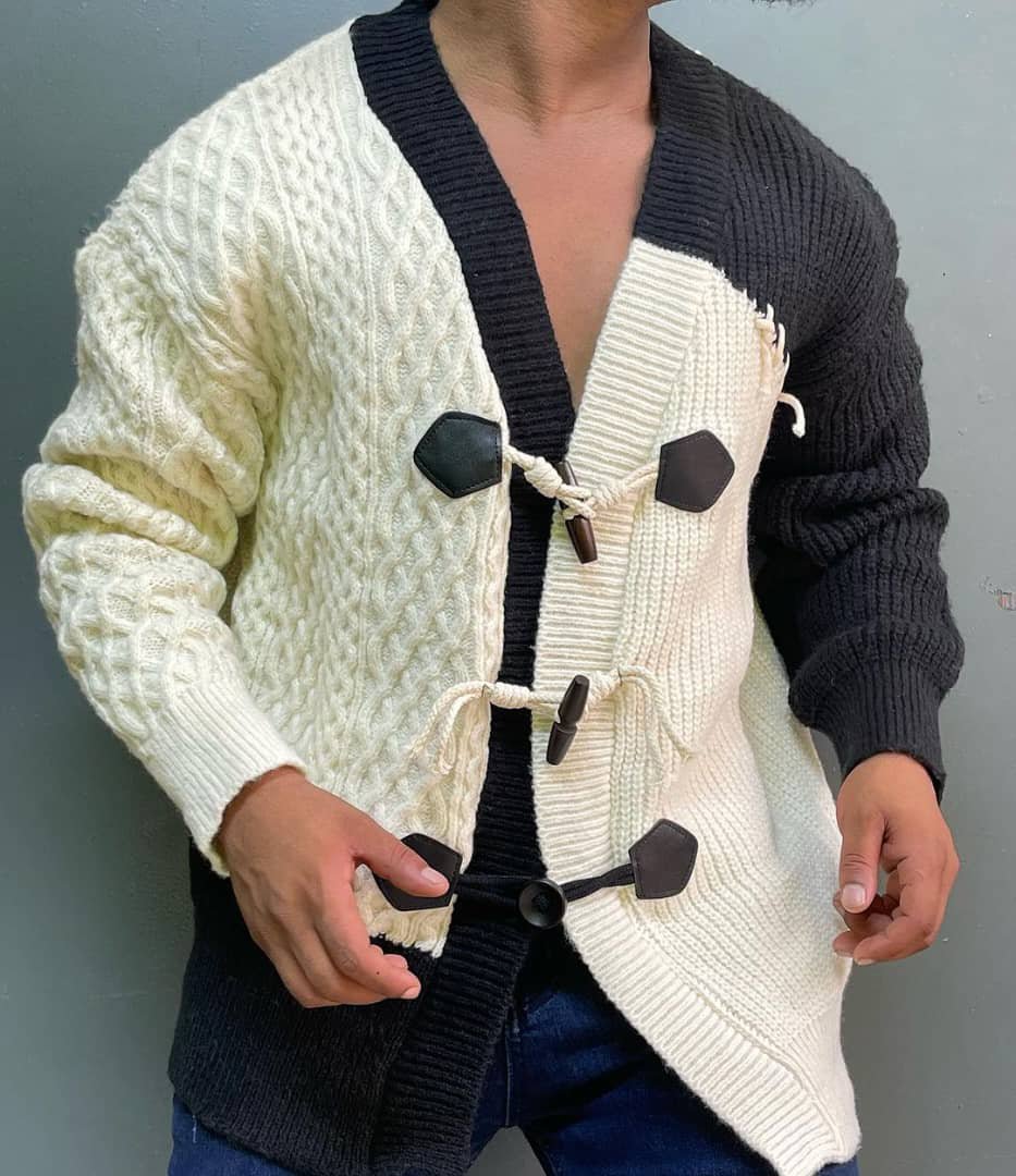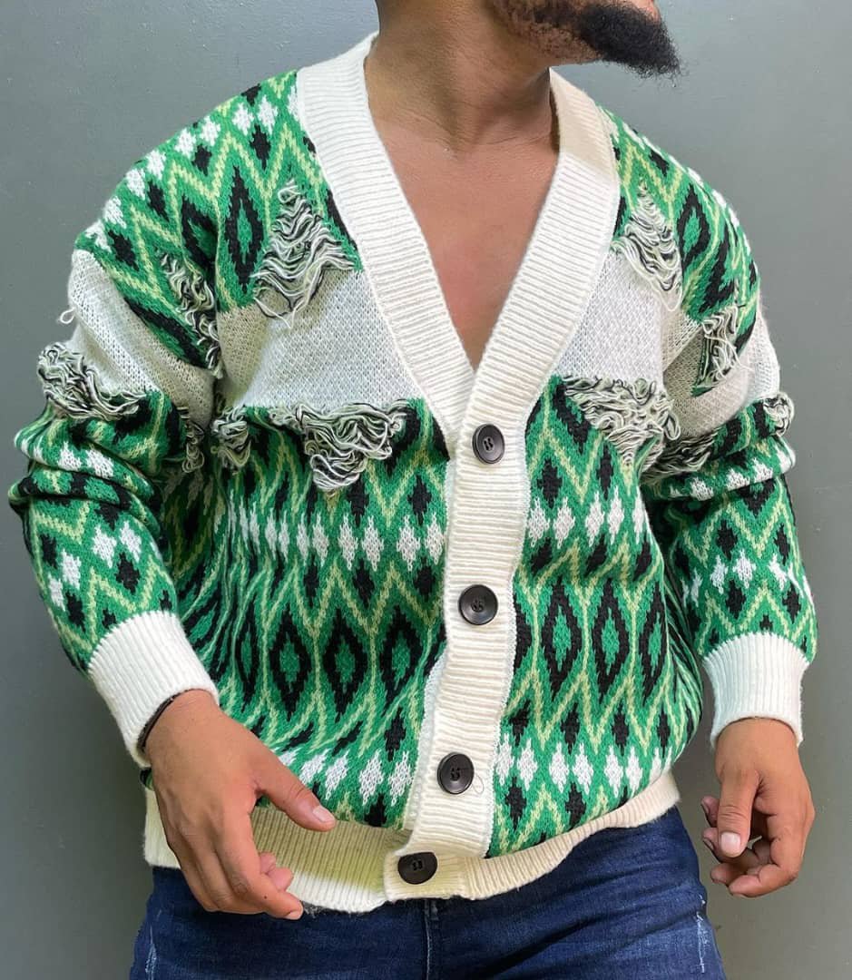 & Free ShippingThe cardigan features a V-neck and button-up closure with four large buttons. It has a geometric diamond pattern in shades of brown and white, with textured, fringed detailing across the chest and upper back.
