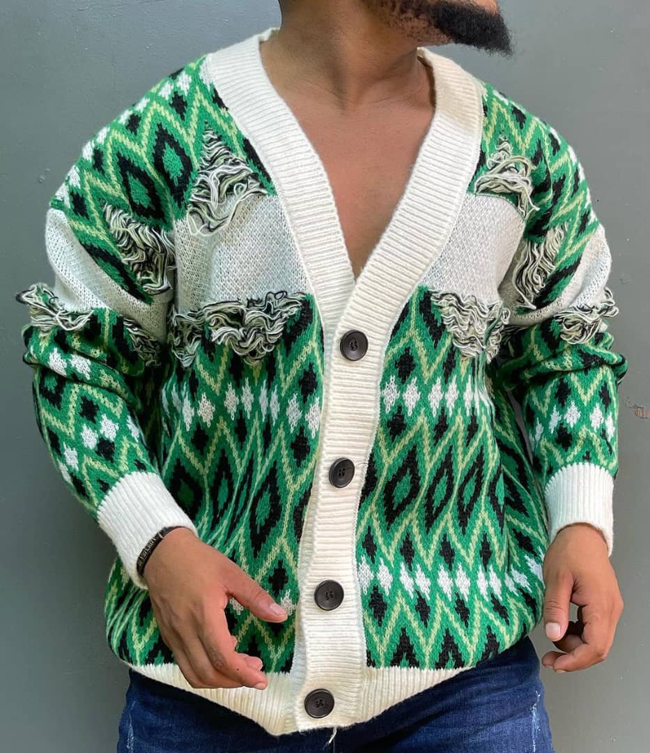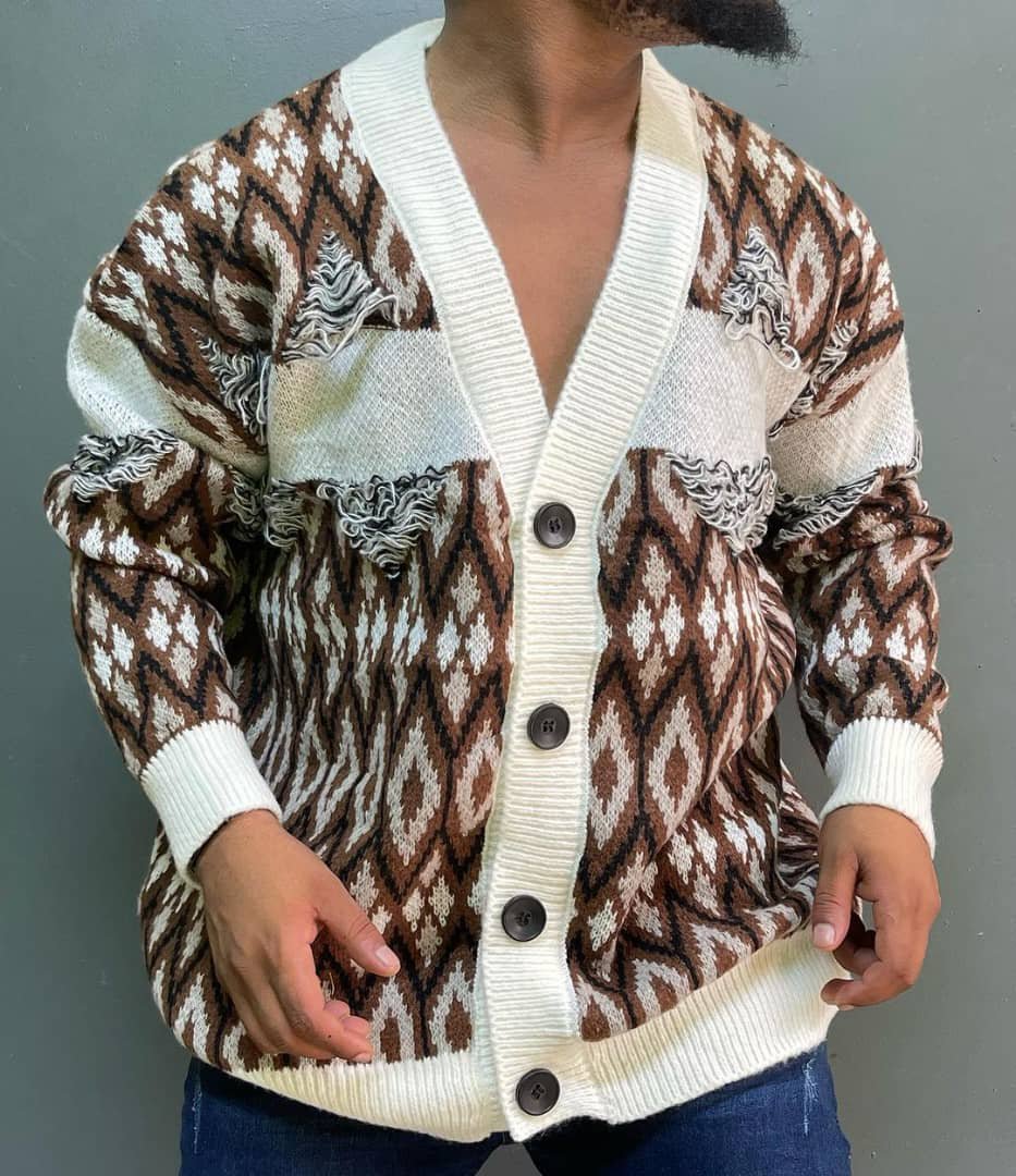 The cardigan features a V-neck and button-up closure with four large buttons. It has a geometric diamond pattern in shades of brown and white, with textured, fringed detailing across the chest and upper back.