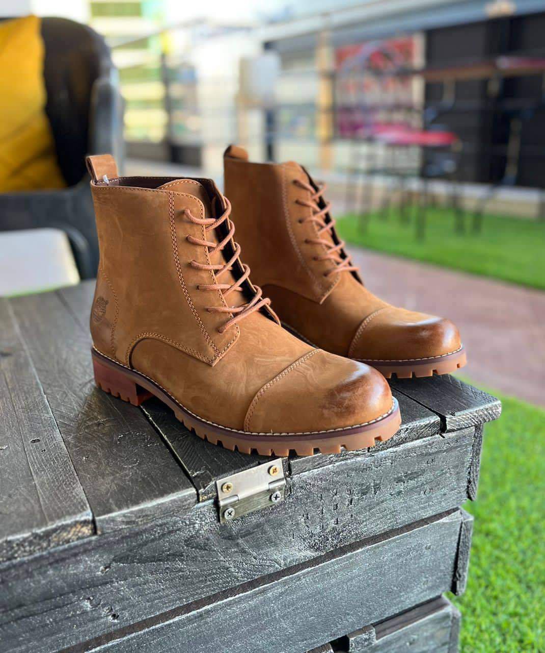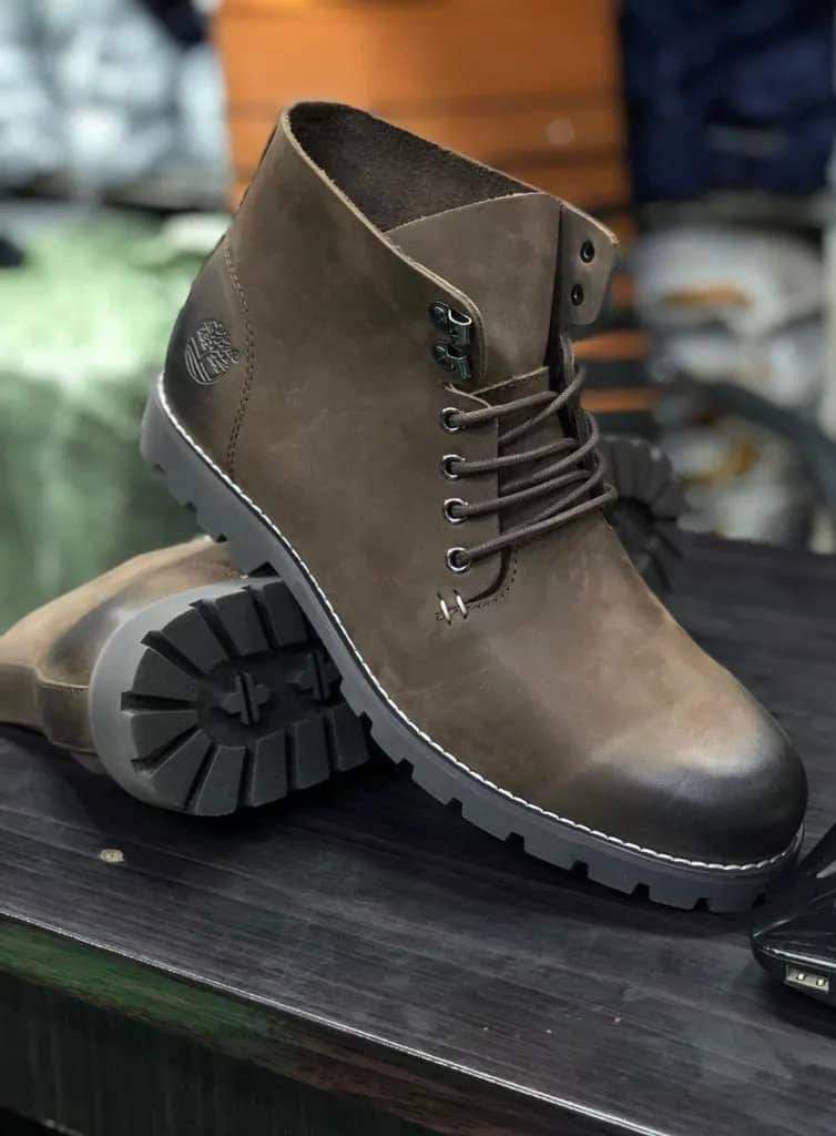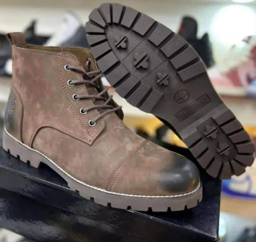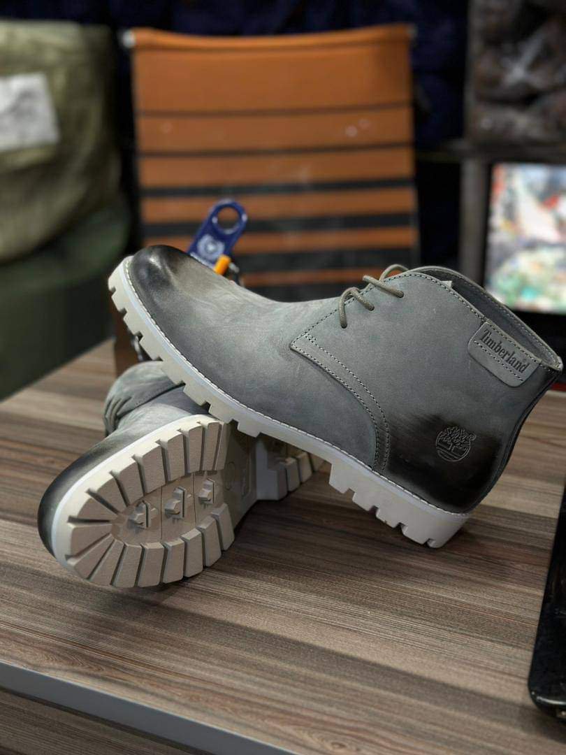 The boots feature a classic lace-up design with a rounded toe and a contrasting dark brown heel. The sole is a lugged rubber for added traction. The boots appear to be made of suede or nubuck leather. Based on the image and search results, these are likely Timberland boots, known for their durability and classic style.