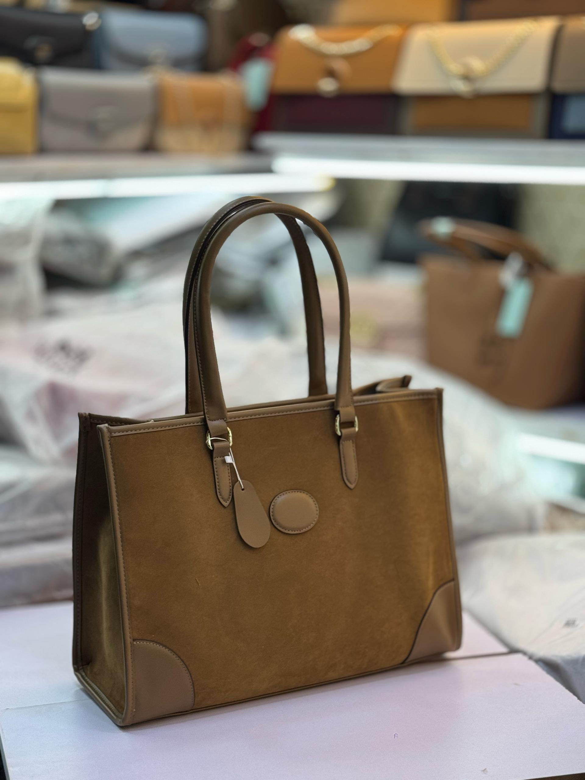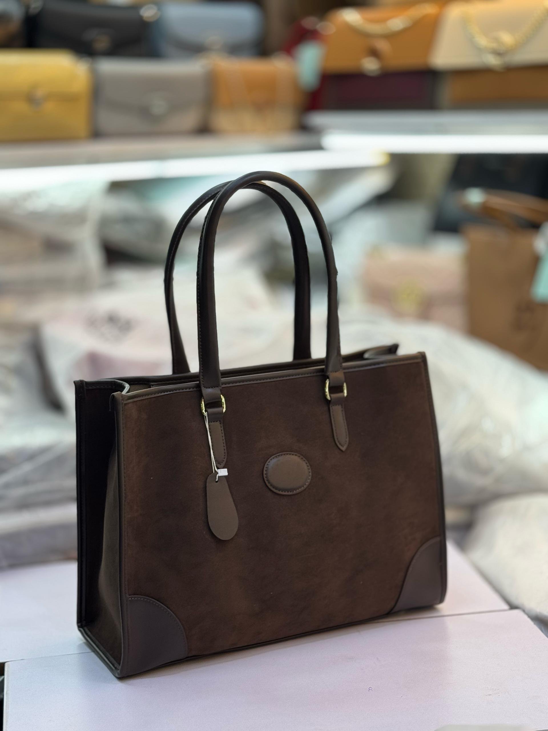 A circular patch is visible on the front of the bag, and a luggage tag is attached to one of the handles. The material appears to be suede or a similar soft fabric, and the overall design suggests a simple yet elegant aesthetic. The bag is positioned on a light-colored surface, possibly a display table, with other bags.