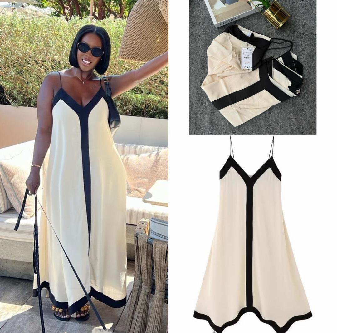 The dress is a casual maxi dress, likely a pleated round neck style, with a V-neckline and spaghetti straps. The color scheme is primarily off-white or cream with black accents. A black vertical stripe runs down the center of the dress, and black trim is present at the hem and around the V-neck.